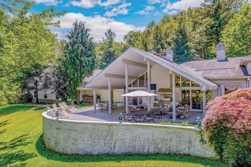 the other. Tucked in the corner is a heavy-duty indoor grill. An old-fashioned dumb waiter runs from the kitchen to the lower level where a commercial-grade refrigerator stores provisions. A pantry/laundry room is off the kitchen. Behind the great room is an astonishing indoor pool complex with high ceilings and a floor-to-ceiling A-shaped window. This area has a changing room, full bath, a wood-lined sauna and a billiard/game room. The mirrors in the great room lift open so activities in the pool area can be monitored. Beyond the pool is an indoor tennis court with room for seating on the sidelines. An elevator allows access to the court a half-floor below the pool suite. The lower level has a temperature-controlled wine cellar, a large play space, and closet after closet with shelves for storage. There is a full bath and two bedrooms on this level that walk out onto the yard. There’s also a workshop, a private computer room/office, and a half bath, all close to a private entrance. Outdoors, the upper terrace is an extension of the dining room and great room, while the lower terrace has the outdoor kitchen including a brick oven, and steps down into the very private yard’s play area and firepit.