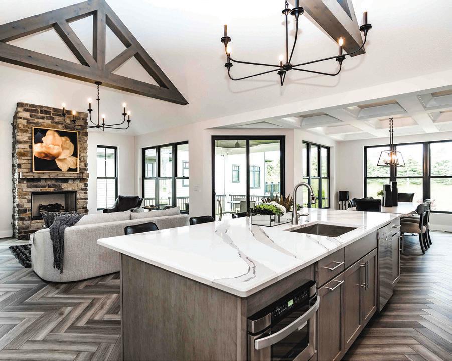 The house features a connected upper and lower terrace. The outdoor kitchen is on the lower level. Here, the upper terrace also connects to the dining and great rooms.