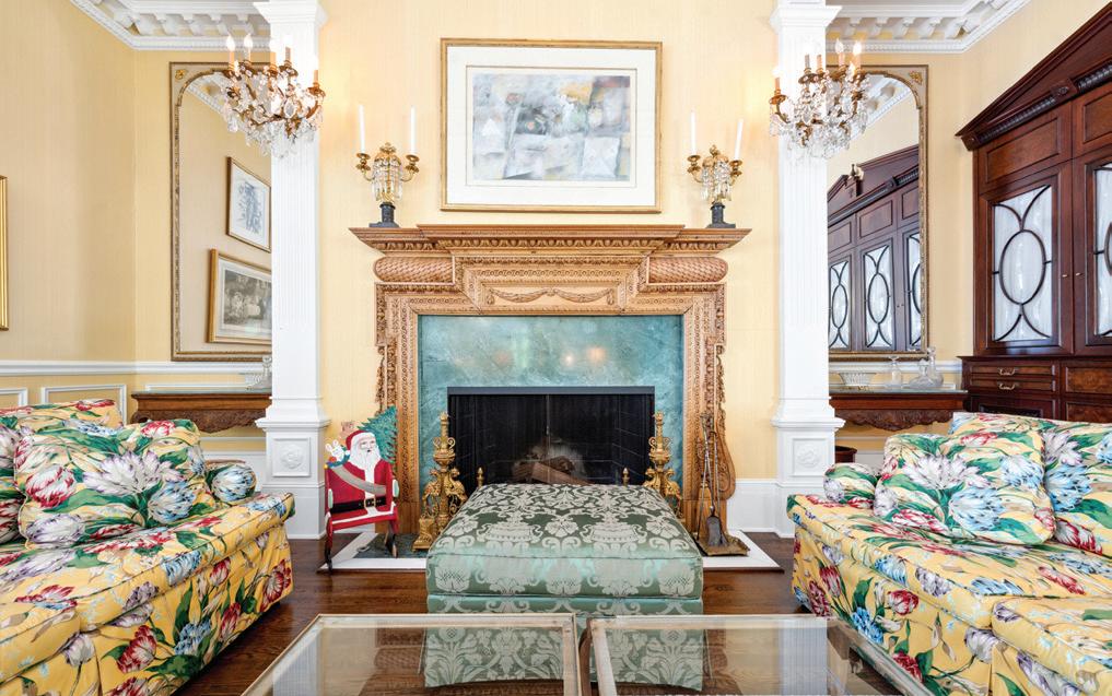 The center portion of the expansive great room has a wood-burning fireplace framed in marble and an elaborately carved wood mantle.