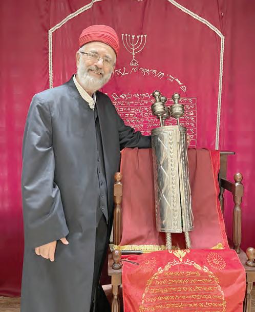 Community Priest Husney Wasef is the manager of the Samaritan Museum on Mount Gerizim in Israel. He stands by a sacred Torah on display in the museum. The scroll written in ancient Hebrew has three crowns designating the three tribes of Israel from which Samaritans say they descend including Levi, Ephraim and Mansi. Photograph by Ellen Jan Kleinerman
