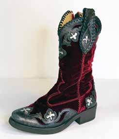 First pair of boots Donald made for his daughter, Starr, in ruby red stretch velvet with black and silver leather trim.