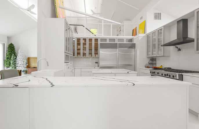 From the foyer to the left, the original front room is now an airy, comfortable office space. The north-facing wall overlooking the front yard is all glass. Behind the foyer, using an L-shaped path, the gourmet kitchen is the heart of the house. A beautiful space, it too has a 19-foot-high ceiling, tons of storage in frosted-glass cabinets, tile backsplashes, a large center island made of poured quartzite, two Sub-Zeros, and a Viking range.