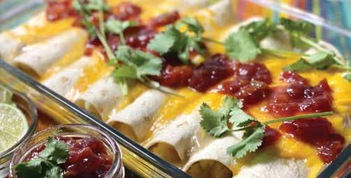Tortillas: On a microwave-safe plate, microwave for 30 sec. to 1 min. until warm and pliable. Assembly: Fill each tortilla evenly with turkey mixture and top with 1 T cranberry sauce in each tortilla. Sprinkle with 1 cup of the divided shredded cheese on the tortillas, then roll tortillas tightly to close and place seam side down in a large baking dish. Pour remaining 1¾ cup enchilada sauce over the tortillas, and sprinkle with remaining 1½ cups shredded cheese. Use remaining cranberry sauce to dot on top of each tortilla. Bake 20 minutes until cheese is melted and bubbly. Serve with selected toppings. (Serves: 4 portions, 2 tortillas each.)
