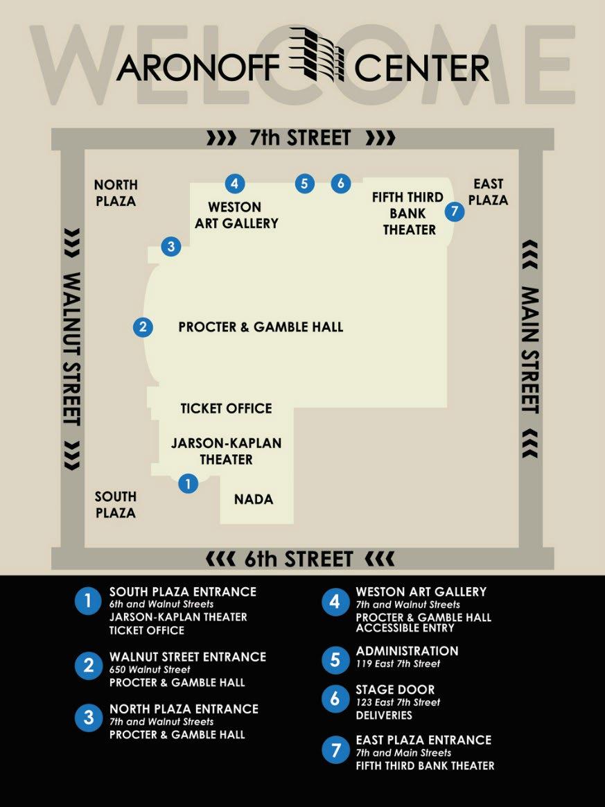 • Procter & Gamble Theater, enter through Walnut Street, North Plaza, or South Plaza.