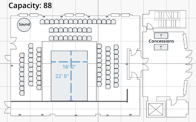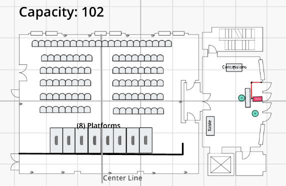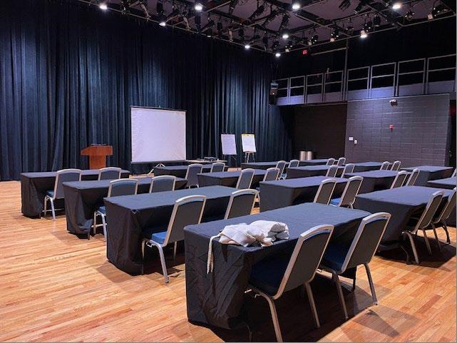 Based on the configuration, the Rehearsal Hall accommodates up to 120 occupants. Theatrical, seated layouts can accommodate up to 80 individuals.