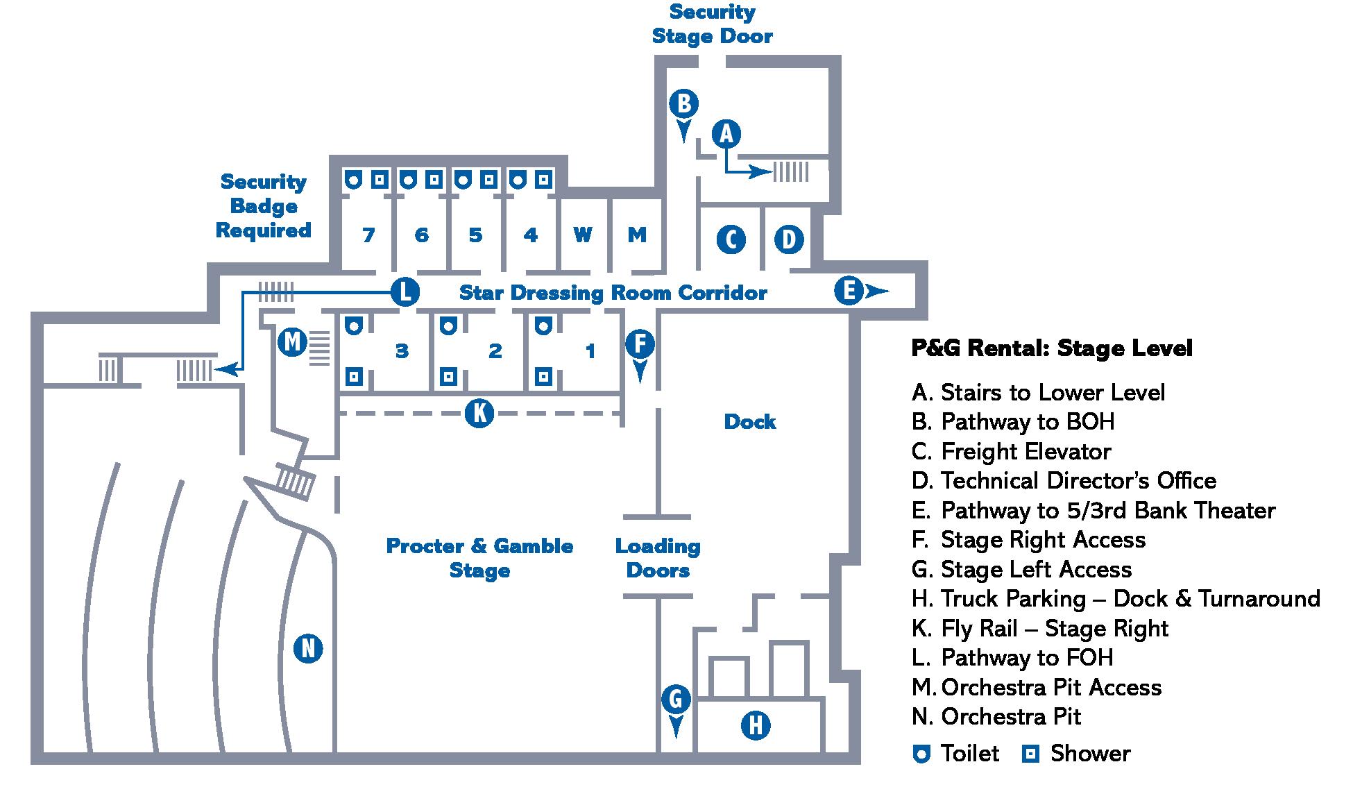 Dressing Room 11 on the lower level is designated for events using the Fifth Third Bank Theater. If there is no event in the Fifth Third Bank Theater, or the event does not necessitate use of a dressing room, Dressing Room 11 may be allocated to other rentals within The Aronoff.