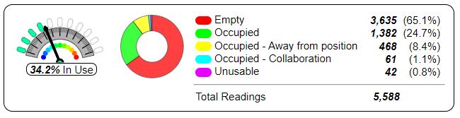 Desk and Office Utilisation: Average utilisation was 34.2%, peaking at 67.7% on Tuesday, 8th October at 11am. At peak times, 42 desks were still available, revealing excess capacity. The lowest recorded utilisation was 3.1% on Friday, 11th October, with 124 desks unused.