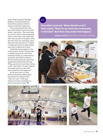 many college programs’ Midnight Madness, incorporating lessons learned from previous events to make an even better experience. “We’re embracing the fact that they build resilience by learning from failure,” says Catlin. “The worst thing we can do to them in these leadership roles is to give them roles where they don’t have any skin in the game, where they don’t have any ownership, where they don’t have any risk in it. Leading is really hard, and if we make leading easy, that’s a disservice to them.” Leadership training played a role in the proctors’ growth. Proctors take a semester-long course with Catlin, including training on communication, inclusivity, and conflict resolution. But the real learning came when they applied those lessons day after day. “Being a proctor isn’t just about having a title,” says Catlin. “It’s about making the people around you feel safer, more connected, more supported.” As the year came to a close, faculty and students alike praised the proctors for raising the bar. “They set a tone,” Catlin says. “And now we have a foundation to build on for years to come.”