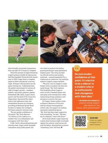 He just exudes confidence at this point. It’s electric to be a sidecar to a student who is so enthusiastic and courageous with their idea.” —JEANINE ESCHENBACH, LOGAN’S DORM PARENT AND HEAD OF THE VISUAL ARTS DEPARTMENT