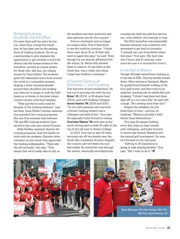 Bringing Cushing Students into the Effort For more than half the years he has run, when Troy crossed the finish line, he has been met by the smiling faces of Cushing students. He set up a partnership to give students the opportunity to get involved in both the charity and the human drama of the marathon, serving as runner guides for those who, like him, are raising money for Dana-Farber. The students greet the exhausted racers from around the world at a vulnerable moment, draping a silver warming blanket around their shoulders and making sure they are in shape to walk the halfdozen or so blocks to the hotel where runners reunite with their families. “They just feel so well cared for because of the Cushing students,” says Jan Ross, Dana-Farber’s former assistant vice president for running programs. She and Troy estimate that between 700 and 800 Cushing students have served in this role over nearly 20 years. Kelly Yardley, assistant director for running programs, does the hands-on work with the students. Runners often comment on how much they appreciate the Cushing ambassadors. “They take the job seriously,” she says. “That means that we’re really able to rely on