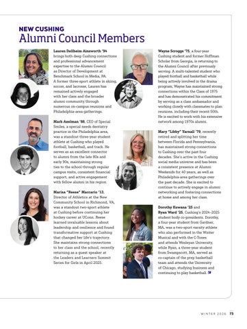 project-based learning initiatives; in the thoughtful restoration of the bell in the Main Building; in our celebration of one hundred years of Cushing hockey; and in the strength of alumni leading our board and serving on our alumni council.