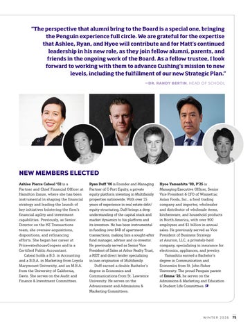 “The perspective that alumni bring to the Board is a special one, bringing the Penguin experience full circle. We are grateful for the expertise that Ashlee, Ryan, and Hyoe will contribute and for Matt’s continued leadership in his new role, as they join fellow alumni, parents, and friends in the ongoing work of the Board. As a fellow trustee, I look forward to working with them to advance Cushing’s mission to new levels, including the fulfillment of our new Strategic Plan.” —DR. RANDY BERTIN, HEAD OF SCHOOL