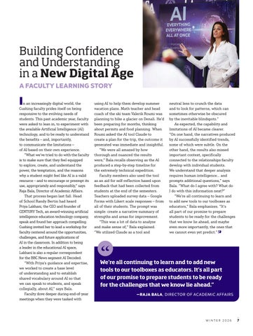 In an increasingly digital world, the Cushing faculty prides itself on being responsive to the evolving needs of students. This past academic year, faculty were asked to lean in, to experiment with the available Artificial Intelligence (AI) technology, and to be ready to understand the benefits — and, importantly, to communicate the limitations — of AI based on their own experience.