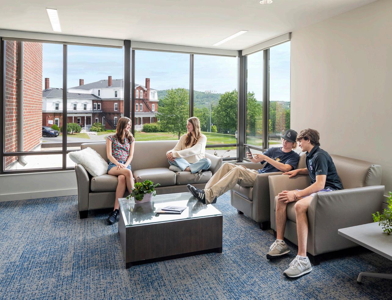 Built in 1915, Ashburnham “Ash” House was remodeled from the ground up in 2018. It received 24 reconfigured double-occupancy rooms, two new bathrooms, new stairways, an elevator, a renovated community room, and three refreshed faculty apartments. Ash House is attached to the FisherWatkins Dining Commons, and the connector includes three new classroom spaces and a stairway leading to the lower level, which includes the remodeled Joseph Treadwell Student Center, an e-sports lab, mailroom, and the campus store.