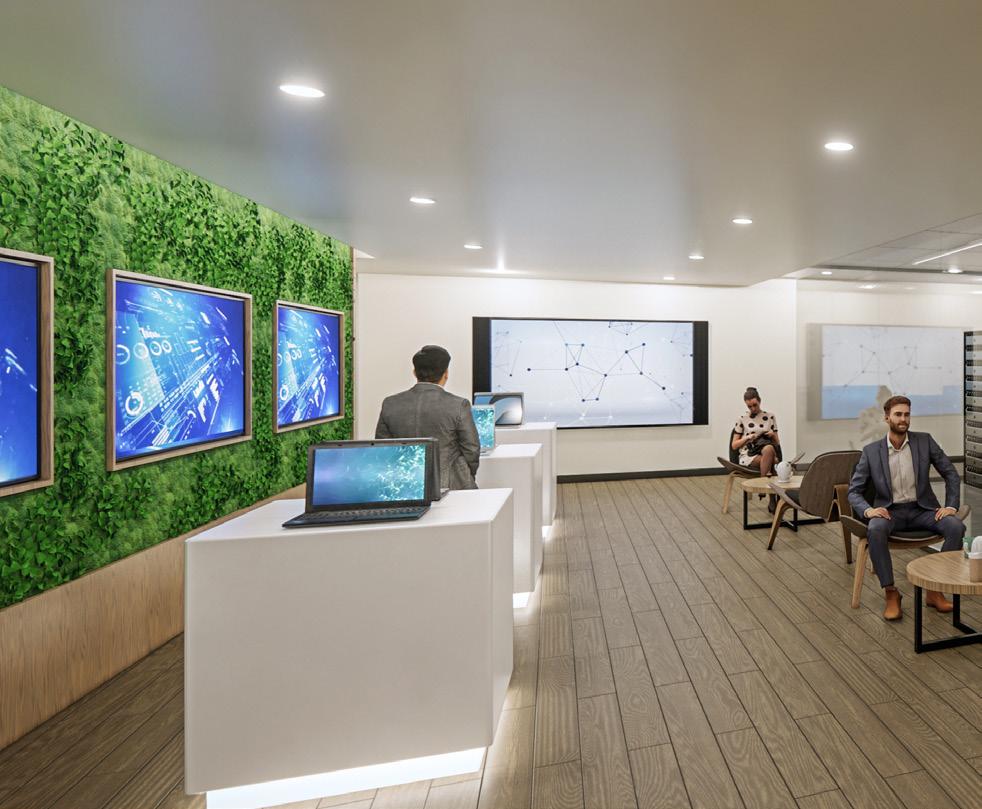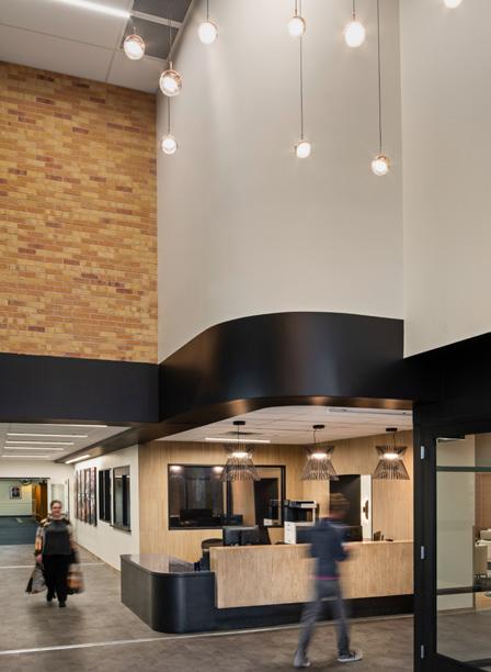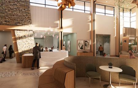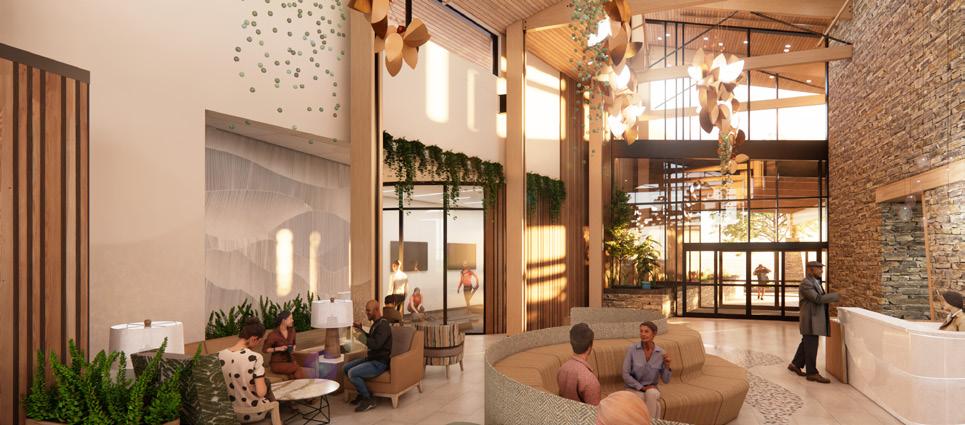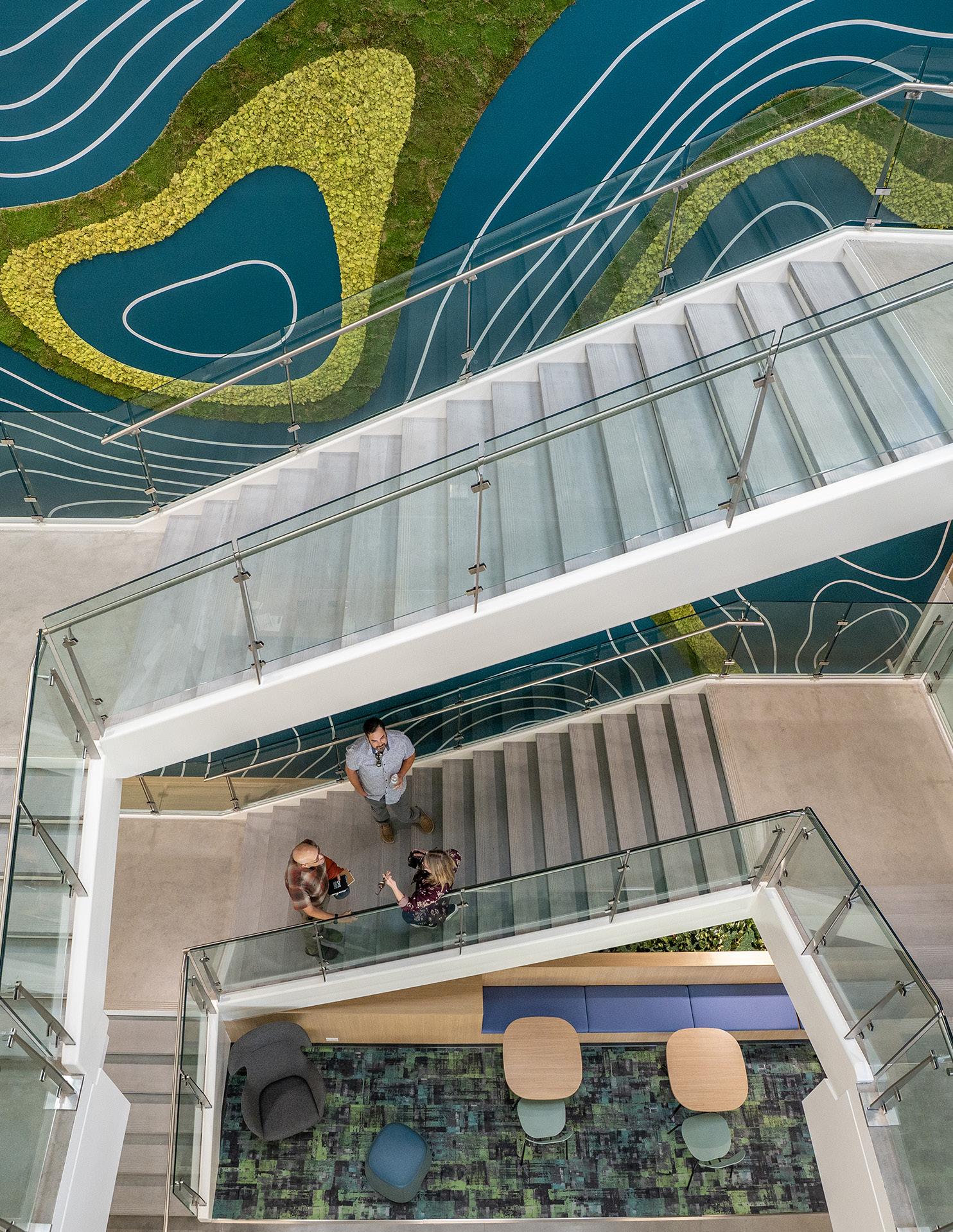 the character and features of the surrounding landscape. The lobby and reception area are imbued with geological forms, including a feature wall that echoes the rock outcroppings and strata found in the region. A two-story map graphic represents the local topography and visually ties together the upper and lower levels of the building.