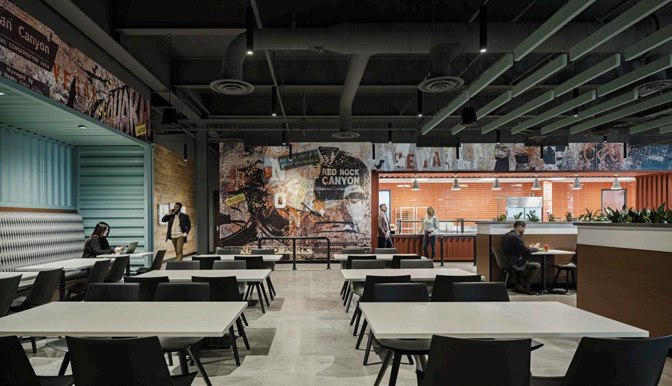 The café space on the main level was another highlight of the project. Through the design, the team paid homage to Nevada’s iconic city, Las Vegas. The “buzziest” spaces in the building, where co-workers come together to eat, play, and be social, received the “Vegas treatment.” The café was inspired specifically by Las Vegas’s Downtown Container Park, a unique place where people gather for shopping, dining, and entertainment.