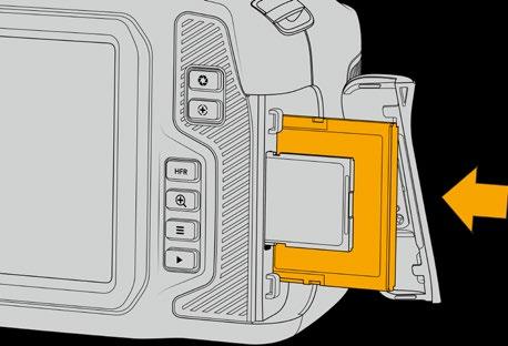Insert the CFast card into the CFast card slot until you feel it lock into place. The card should insert easily without the need for excessive force. To remove a CFast card, gently push the CFast card in and then release to eject it.