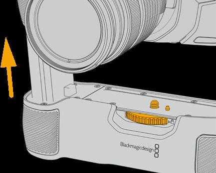 Now that you’ve attached a lens, you will need to supply power to your camera. Pocket Cinema Camera 6K Pro can be powered by inserting an NP-F570 battery, and Pocket Cinema Camera 6K and 4K can be powered by inserting an LP-E6 battery. You also have the option of powering your Pocket Cinema Camera from the supplied AC power adapter or from two NP-F570 batteries in a Blackmagic battery grip. For information about adding a battery grip to your Pocket Cinema Camera, see the ‘using a battery grip’ section.