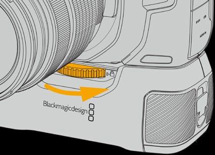 Pocket Cinema Camera 6K and 6K Pro use EF lenses and Pocket Cinema Camera 4K uses Micro Four Thirds lenses. Attaching a lens to your camera is the same process for all Pocket Cinema Cameras. Begin by removing the protective dust cap. To remove the protective dust cap, hold down the locking button and rotate the cap counterclockwise until it is released.
