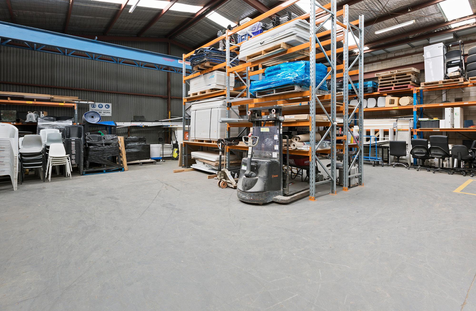 The warehouse area features a clear-span layout with high internal clearance, durable concrete flooring and a container-height roller doors for smooth loading and unloading. Heavy-duty shelving and a mezzanine level offer additional storage flexibility, while high-bay LED lighting ensures a safe and well-lit environment.