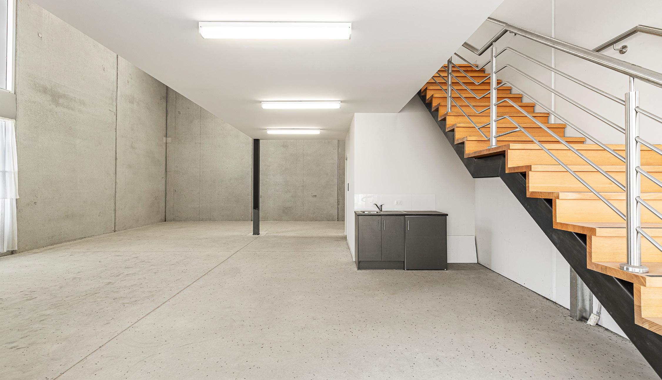The property at 1 Bonavita Court, Chirnside Park showcases a clean, modern industrial space with a range of practical and stylish improvements. The high-clearance warehouse features a clearspan layout with polished concrete flooring and exposed concrete walls, creating a robust and low-maintenance environment. A container-height motorised roller door provides easy access for deliveries and logistics. Internally, a sleek kitchenette is positioned beneath a timber staircase with stainless steel balustrading, which leads to a lightfilled first-floor office.