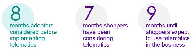 Shoppers are taking their time when choosing a telematics provider, too. Those who have adopted the technology spent an average of eight months investigating solutions before implementing them. Our data indicate that new adopters will be even more deliberate in their research and planning. Current shoppers say they have already spent an average of seven months considering offerings and anticipate it will be another nine until they purchase and integrate a telematics solution into their fleet business.