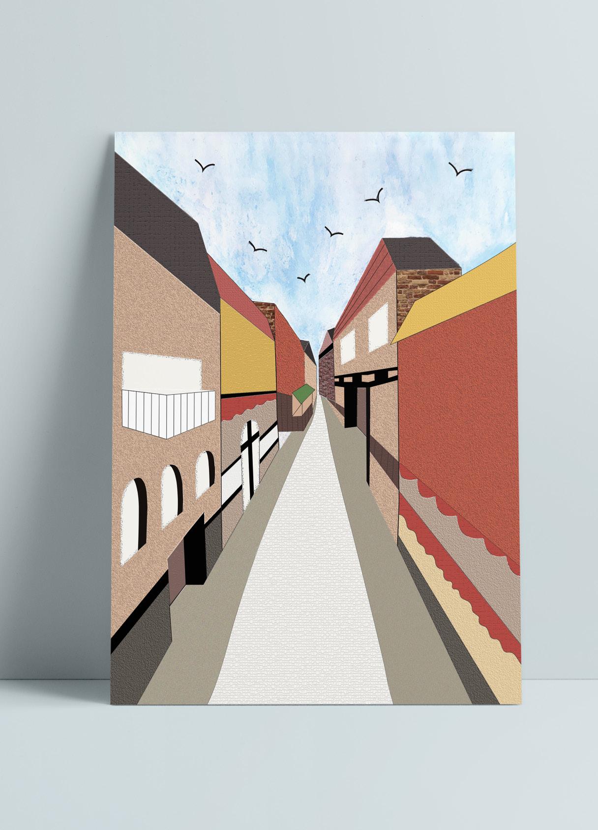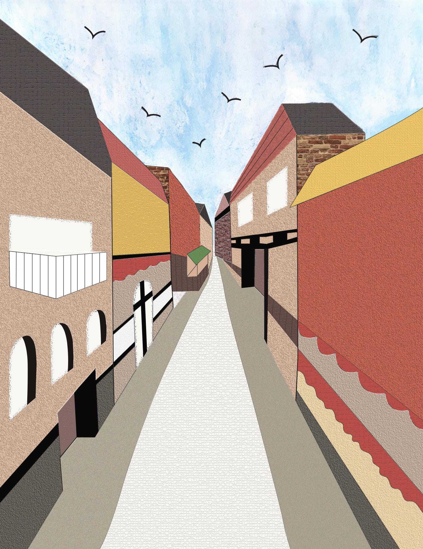 The subject I drew for my final piece is a one-point perspective of a street with multiple buildings. The mediums I used were black ink and watercolor because I wanted to challenge myself with a medium that I was not confident with. The black ink was used to create outlines on the buildings and help illustrate some of the smaller details such as cracks in the road and sidewalk as well as for the small birds in the sky. I used watercolor to make sky background along with adding a wash of color to the buildings and pavement color to the sidewalk and road. The drawing techniques I used were mainly cross-hatching, pressured line work. I would use the cross-hatching technique to add a textured look to some of the roofing on the buildings and to create shading on the windows. Pressured line was used to add dimension, depth, and variety to the piece. The color scheme I was aiming for was rustic, yet colorful.