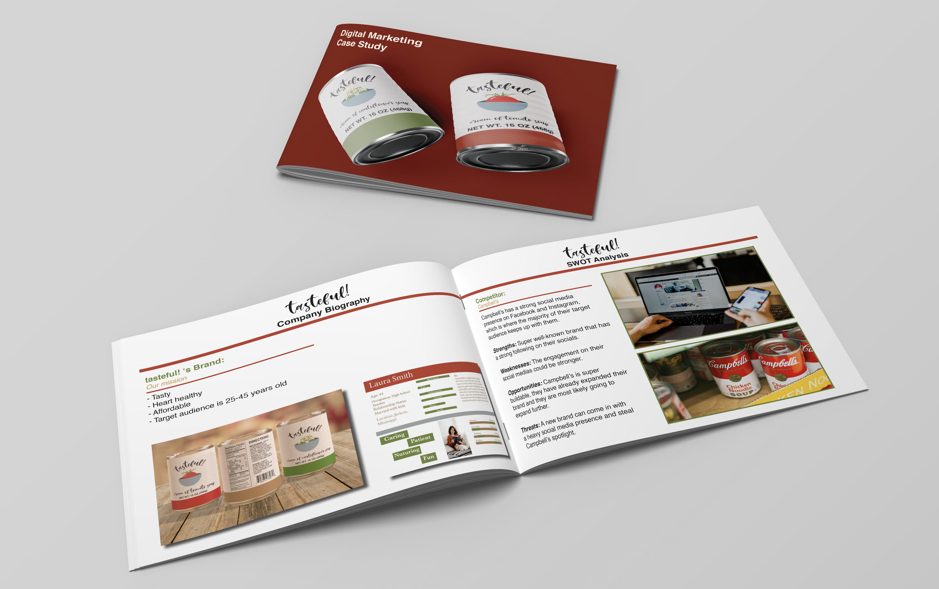 The name tasteful! to show that my brand is not only playful but is also delicious and healthy. Tasteful! is in Mishella Regular font which makes the word mark stand out from most of the other soup companies on the market. The tasteful! logo type is also curved to be around the mark rather than horizontally for even more consumer appeal. The nutrition label and directions are all in a sans-serif font so they can be legible at any distance. The logos are more illustrative to appeal to all ages. I chose the color palette of light blue, a toned-down red, muted brown, and a dull green to correlate the flavors of soup to the packaging. Red is for cream of tomato, brown for cream of potato and green for cream of cauliflower. The light blue was chosen for the bowl because it complements well with all the other colors used in the brand.