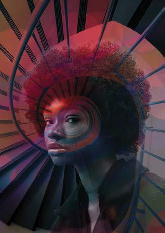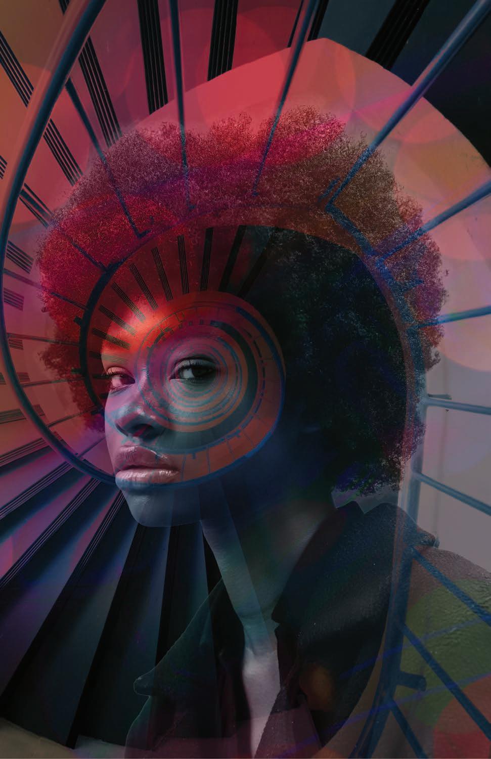 The photo composite incorporated an image of a woman, a spiral staircase, and various images of colored lighting. The golden ratio was used into the design through using the image of the spiral staircase to lead to the woman’s eye. I also decided to use a color overlay on the image of the woman and the images of the colored lighting to add further dimension and details to the piece.
