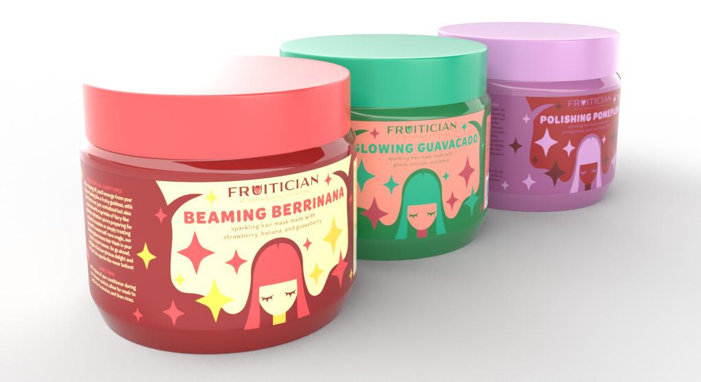 Fruitician’s hair mask packaging is a harmonious blend of efficacy and allure, embodying the brand’s commitment to healthy, dazzling hair. The packaging design is a visual celebration of nature’s bounty, with each variant Beaming Berrinana, Glowing Guavacado, and Polishing Pomeplum represented by vibrant colors that mirror the fruits infused in the masks. The labels feature captivating illustrations of women with long, flowing hair surrounded by delicate sparkles, evoking the transformative and luminous qualities of the product. This imagery not only enhances the visual appeal but also conveys the promise of healthy, radiant hair that Fruitician’s masks deliver.