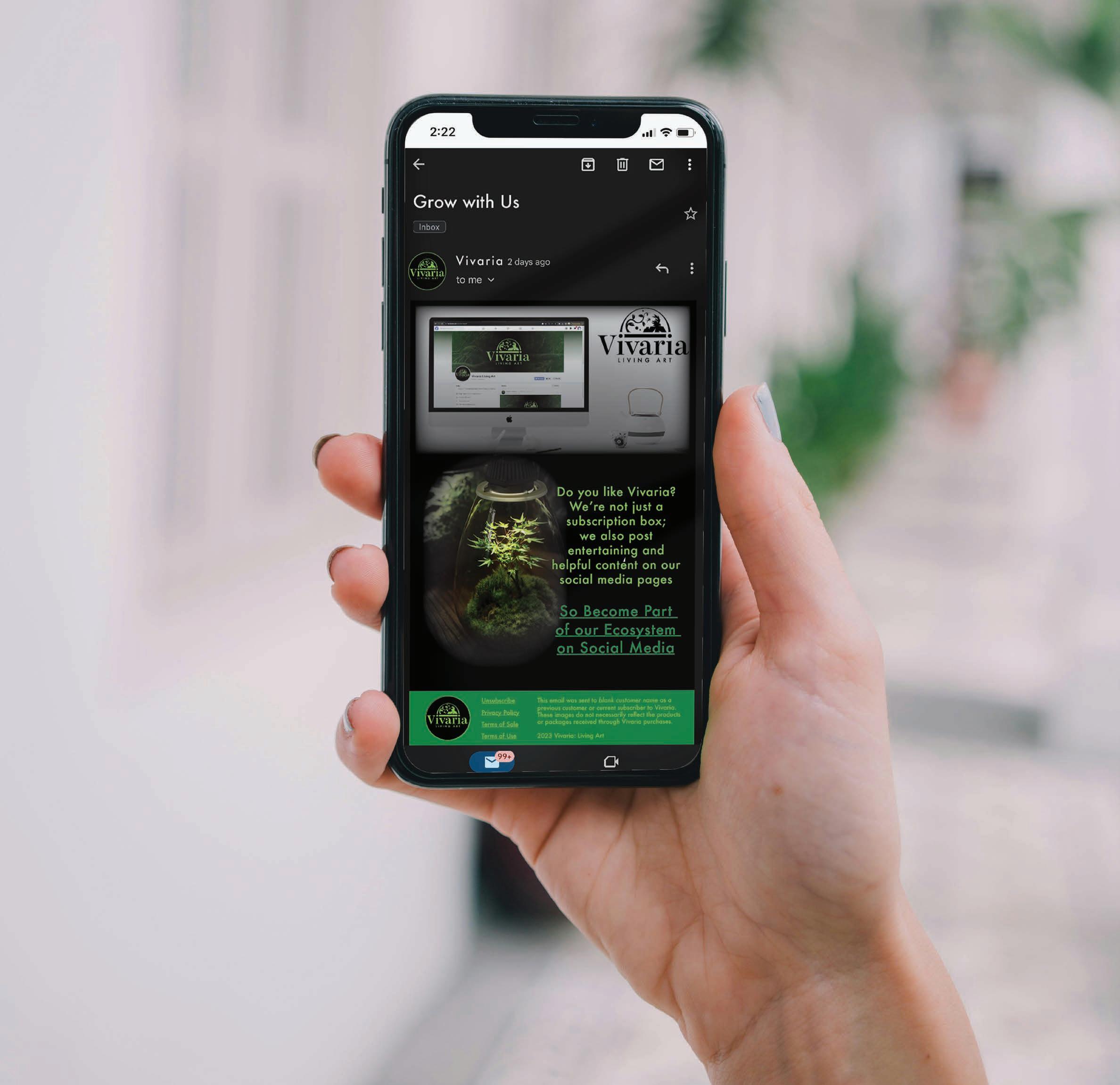 Vivaria is a subscription box service that delivers readyto-construct enclosed terrariums on a bimonthly basis. The company colors, patterns, and packaging all feature a sharp, cool color palette contrasted against a sleek black backdrop, meant to evoke mystery, akin to the wonder of discovering new creatures and plants in nature. Vivaria’s primary email campaign focuses on creating an engaging platform for followers to subscribe to, which includes special offers to long-time subscribers and offers sneak peaks at upcoming products, which are all outlined in a complete digital marketing case study that encapsulates a sum of strategic initiatives, data-driven decisions, and the pursuit of excellence in the ever-evolving landscape of online promotion.