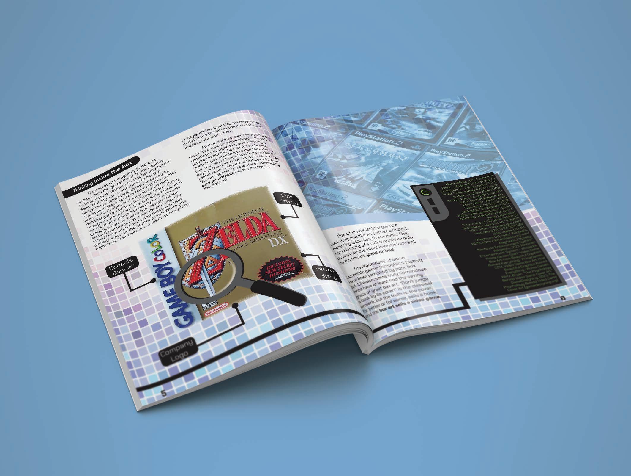 The Design Behind Box Art is a magazine article detailing the history and design of box art in the video game industry. The subject of box art was chosen due to its fascinating design obstacles and goals, which must convey the visuals, gameplay, story, and mechanics of a game all in one easy-to-understand cover. The main san-serif typeface Obvia works well as a readable body copy in regular form while also serving as a striking title in bold, with geometric pixel-like strokes, reminiscent of classical videogames and their displays. All imagery and graphics used in the design are also meant to harken back to videogame displays with large geometric shapes and bold, primary colors. The standout feature of the spreads is the cable that runs along the bottom of all six pages, acting as a continuing line of interest for the readers eye to follow.