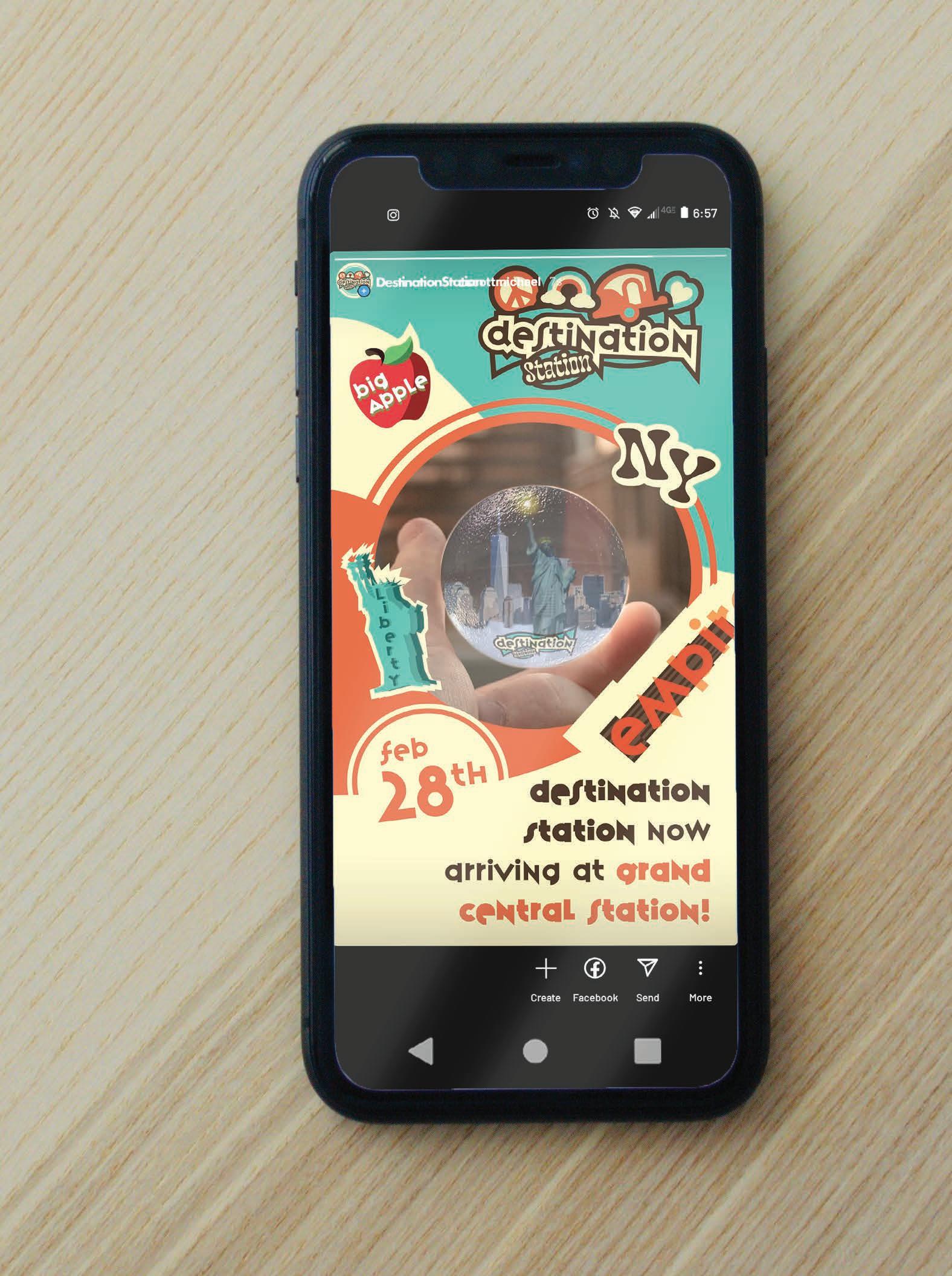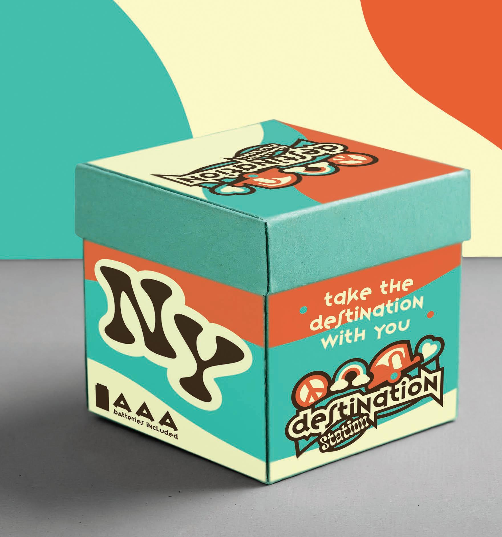 The Destination Station is a vending machine that markets to tourists and customers of famous landmarks throughout the United States by selling trinkets and knickknacks in a convenient vending-form gift shop. The standout quality of Destination Station is the ability to deliver quality memorabilia away from the crowded, overpriced gift shops that plague established tourist traps. The visual identity is inspired by the vintage style of Americana, with the warm, inviting color palette alluding to classic roadside attractions and tourist traps. The company branding takes cues from the overpriced trinkets, the gaudy postcards, and the flashy bumper stickers that make up the collection of souvenirs commonly purchased during an old fashioned family road trip.