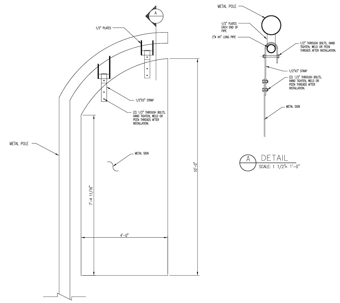 This metal sign will hang down from a light pole in the parking lot, connecting using metal straps and bolts. It will lead guests to the