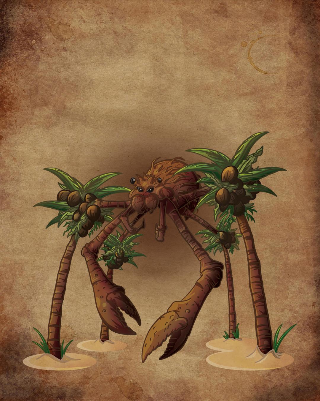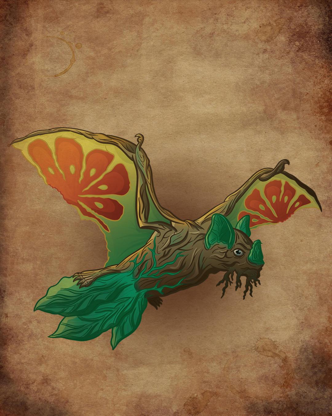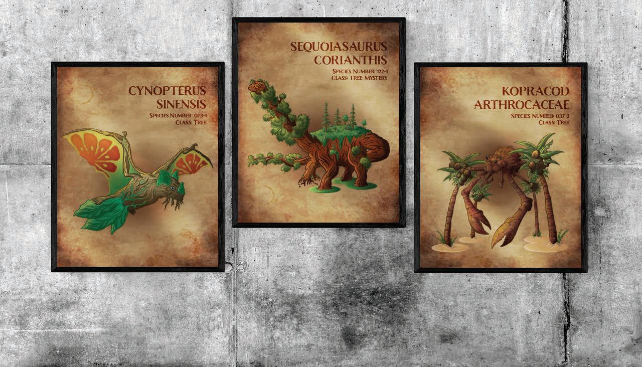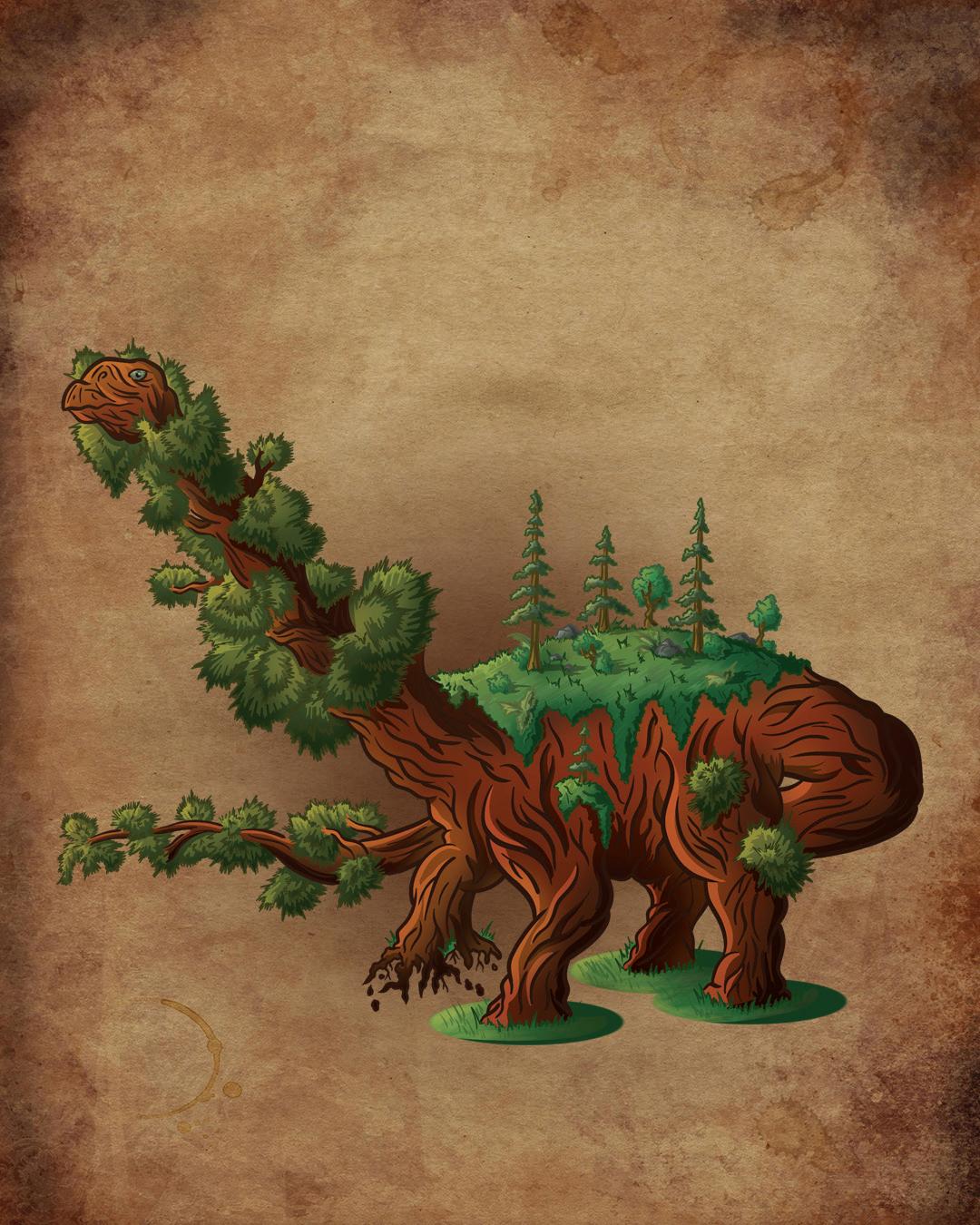 The strange realm of auras is home to several odd and mysterious creatures, known as the Auramorphs. These beings exist in several classes, with the tree class encapsulating creatures that blur the line between flora and fauna, including a sauropod with a tree for a neck, a fruit bat that has real fruit for wings, and a coconut crab with palm-tree-like legs. The design of these creatures takes inspiration from several real-world sources and simply blends them together into a concept that could believably exist, albeit with a suspension of disbelief. This can be seen in the tree-dinosaur hybrid, which combines the similar attributes of a long-necked dinosaur with the spiring branches of a pine tree.
