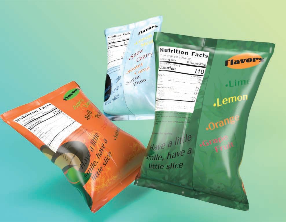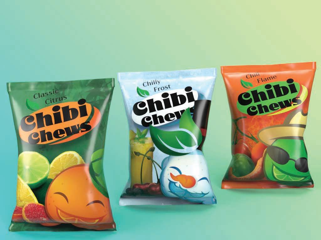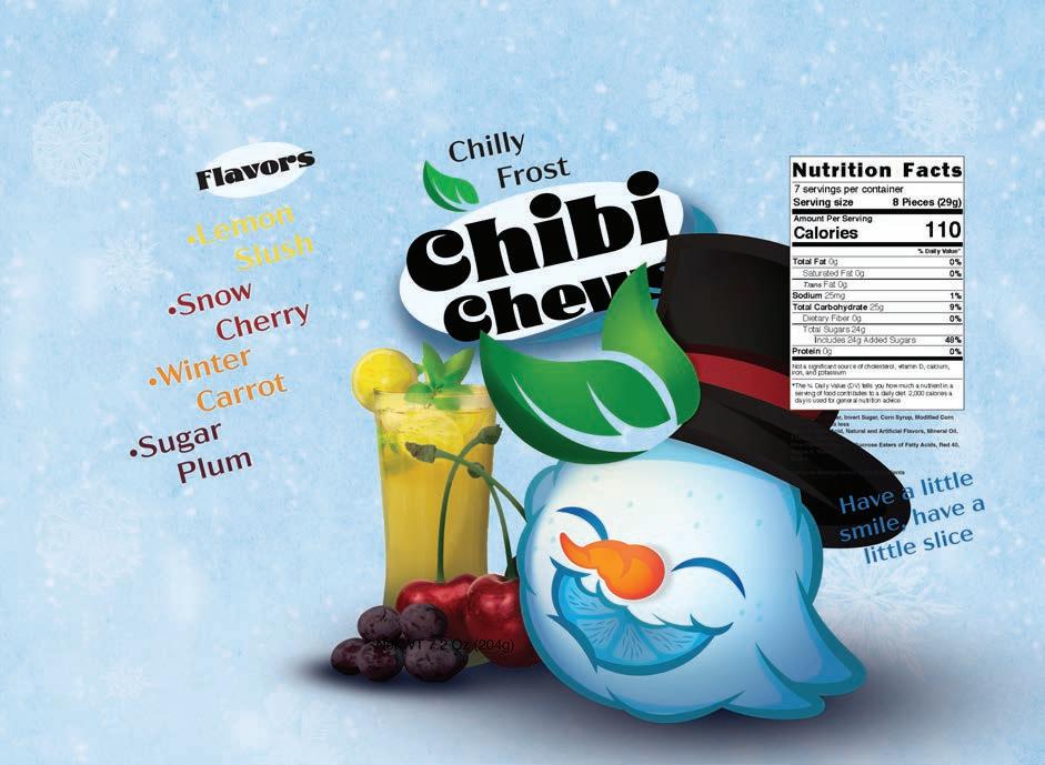 Chibi Chews is a brand of fruity, chewy candies. The overall aesthetic is fun and playful but not too childish, marketing to teens and young adults with a modern take on candy. The packaging is minimalistic while also fully highlighting all necessary details and components, including the logo, mascot, colorful graphics, and the overall theme of each flavor variety. The company slogan, “Have a little smile, have a little slice,” works as a compliment to both the main company mascot and the name. The phrase “little slice” acts as a synonym for the company name, Chibi Chews. Meanwhile, the orange character on the front of the candy bags always has a smile, which is also a citrus slice.