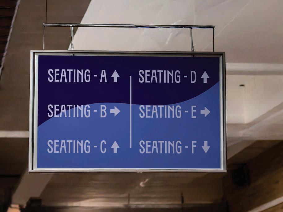 This vinyl sign will hang from the ceiling, directing guests to their seats. It will be connected using bolts and a metal cable.