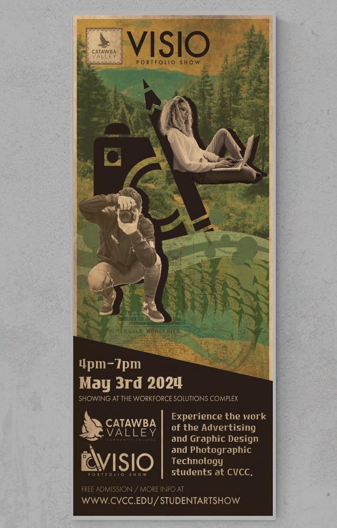 Taking the existing name of “Vision,” Visio makes a simple change that results in a clean, modern name that also forms a catchy rhyming scheme with both “show” and “portfolio.” The wordmark is a combination of two iconic creative symbols, the pencil of a designer and the camera of a photographer, representing the two faces of the CVCC portfolio show. The poster design inspiration was taken from classic postcards of the American Northwest, blending together classic earthy tones and woodland imagery. The design itself is balanced around the Visio logo, incorporating a photographer and a graphic designer on opposite sides of the piece, with each side of the background differing between a photo and a digital design as well.