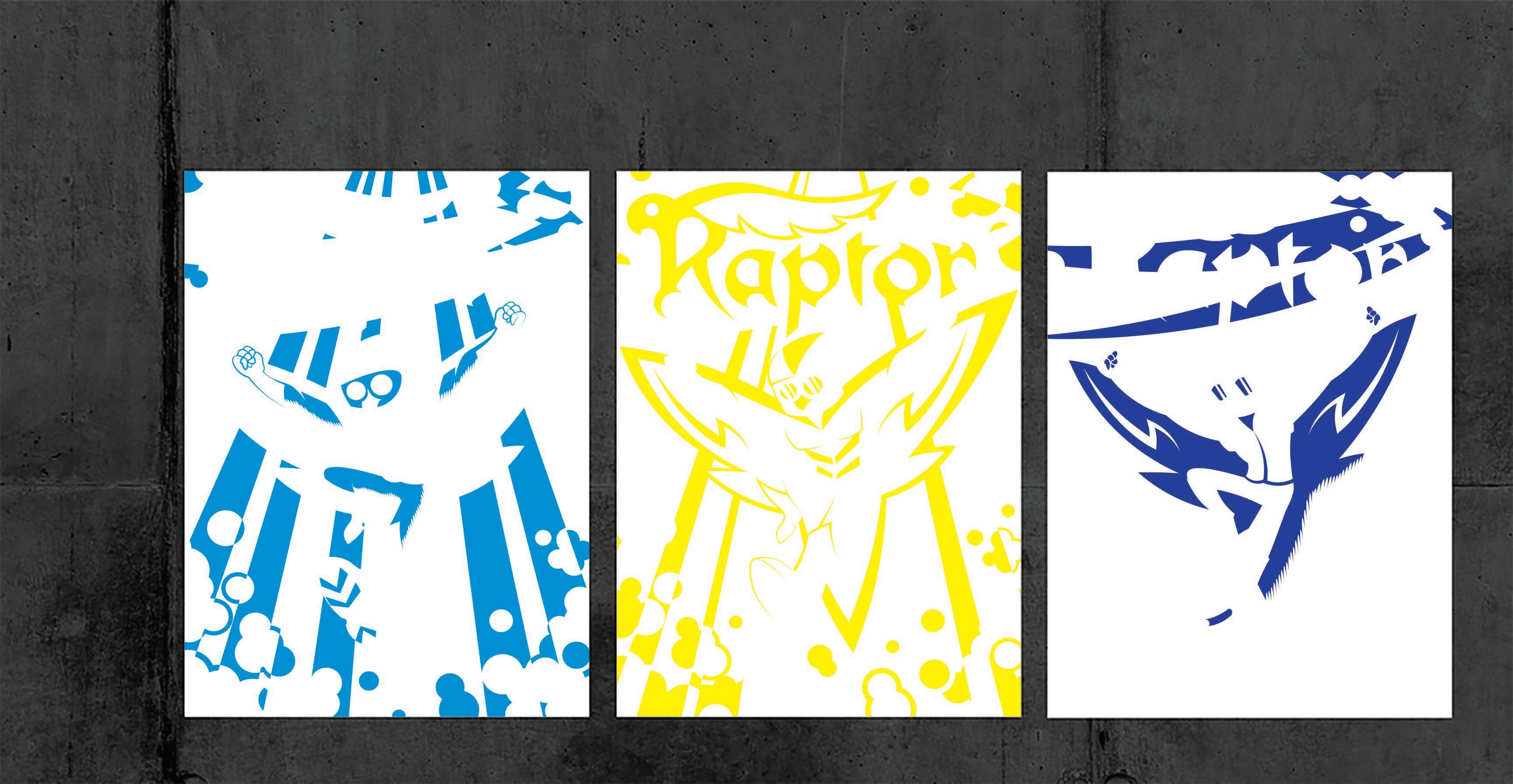 The Raptor is a super-powered vigilante whose design takes cues from a homemade source, incorporating jeans, a biker helmet, and a leather jacket, giving the feel of a superhero costume made from whatever pieces were found around the house. The poster design emphasizes movement and is designed from a very low point of view, only increasing the dynamic feel of the poster as the Raptor swoops down from the top of the screen. The colors and imagery are inspired by the Bronze Age of comics. This era of comic books contrasted the bright and bold colors of the earlier eras with darker and more muted palettes, mainly grays and blacks.