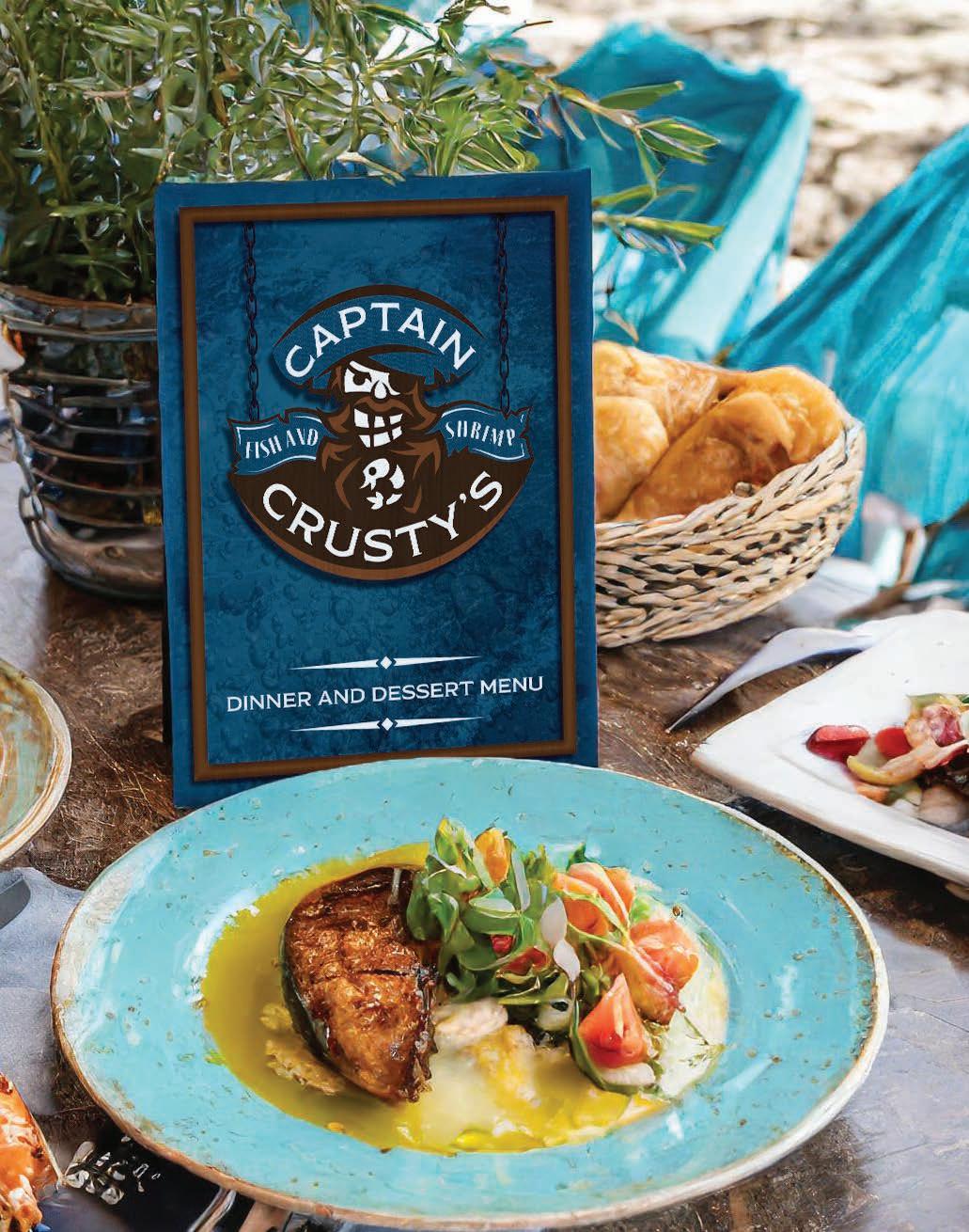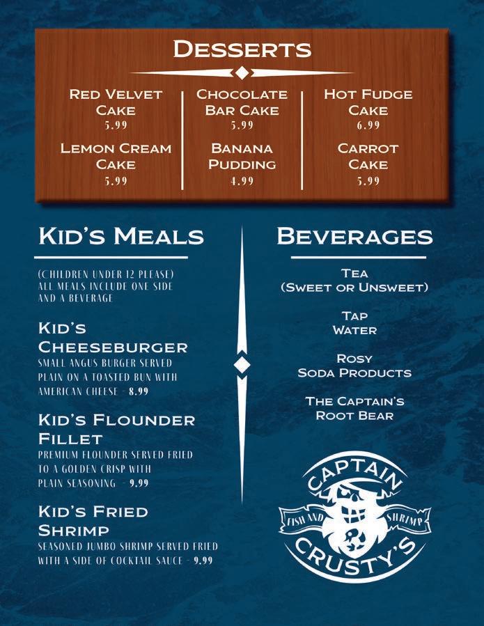 Captain Crusty’s Fish and Shrimp is an upscale fish camp located along the Atlantic coast. They offer topquality seafood at a reasonable price, complemented by beautiful views of the ocean and an immersive pirate ambiance. As customers are seated by a themed member of the wait staff, they can then peruse a finely crafted menu of coastal delicacies. To complement the scurvy aesthetic of the restaurant, the wait staff, menu, and primary branding of Crusty’s are influenced by a noble vessel trekking across stormy waters, with the company colors showing a cool, murky blue contrasted against a warm wooden framing. The captain himself, as depicted in the logo, carries the crude but lighthearted nature of a pirate, complete with a leftover shrimp lost in the waves of his beard.