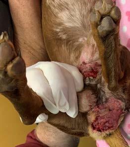 The clinical picture of CME in Australia seems to have changed over the last three years. Originally, during 2020-2021, as CME established, a severe clinical syndrome was encountered in northern Australia, notably within indigenous communities. Epistaxis was often profound (Figure 2a) and life-threatening, and body temperatures as high as 41.5°C were not uncommon. Some dogs presented with dyspnoea and fever, but no bleeding, and in others cachexia was often rapid in onset. Dogs with pancytopenia rapidly progressed to sepsis and uncontrollable bleeding within a few days, and some dogs presented with blindness due to retinal haemorrhages. Another group developed generalised dependant oedema months after the acute illness, characterised by marked swelling of the face, neck and limbs (Figure 2b) and occasionally the scrotum (Figure 2c)