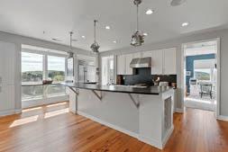 The contemporary chef’s kitchen features an abundance of natural light, an induction cooktop, two wall ovens, and a large island with eating area, while the third floor seating area features a wallmounted TV, plenty of seating, and framed images taken by local photographer Robert Llewellyn.