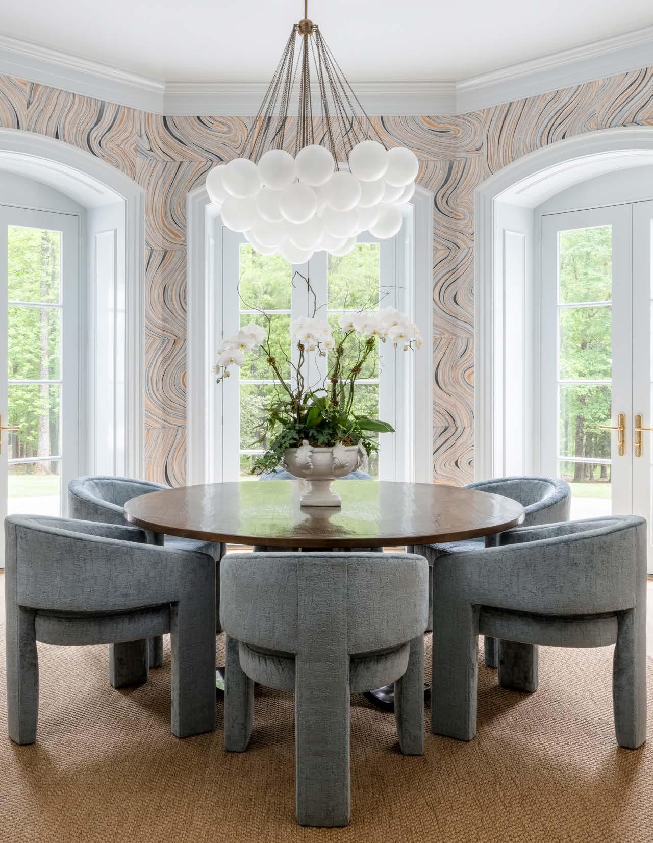semicircular custom-upholstered chairs. The handpainted wallpaper is Marble from Gracie, and the amazing floating-balloons ceiling light fixture is Cloud from Apparatus Studio.