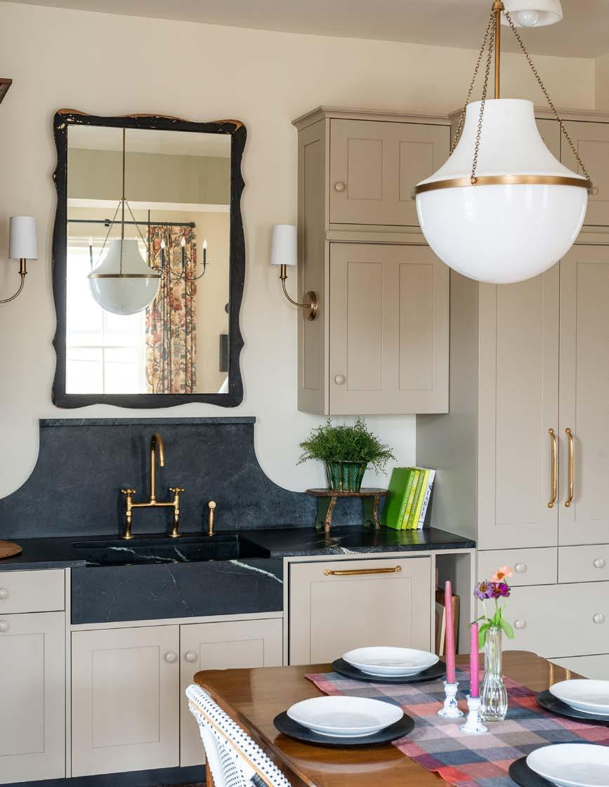 Bazemore’s vision for the kitchen was also a COVID offshoot: She and Pelton had become devoted viewers of deVOL’s “For the Love of Kitchens” show. While the kitchen layout wasn’t changed, its cabinetry was very much deVOL-inspired (the Shaker kitchen cabinets are painted in Benjamin Moore Turret; the sink, countertops, and backsplash are Alberene soapstone), and some of the cabinet hardware was actually ordered from deVOL. Bazemore and Lane worked closely on details. For example, Lane says one of her pet peeves is “sinks without a view,” but hanging a large vintage mirror over the sink (an idea Bazemore got from Pinterest) brings the living space and its view into the kitchen.