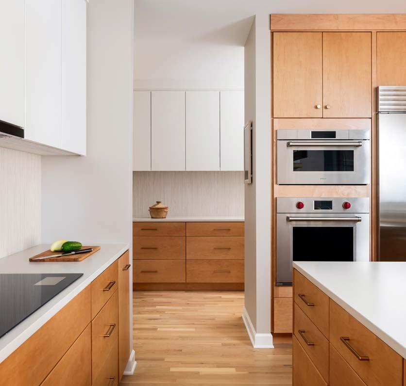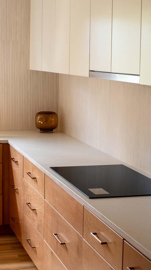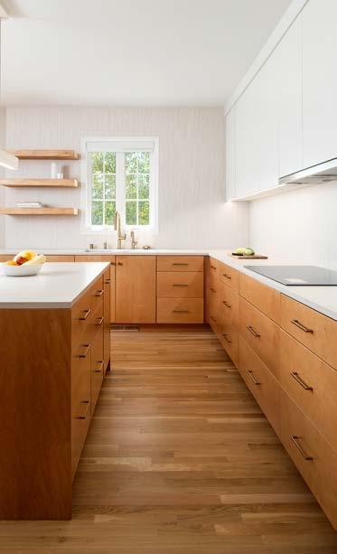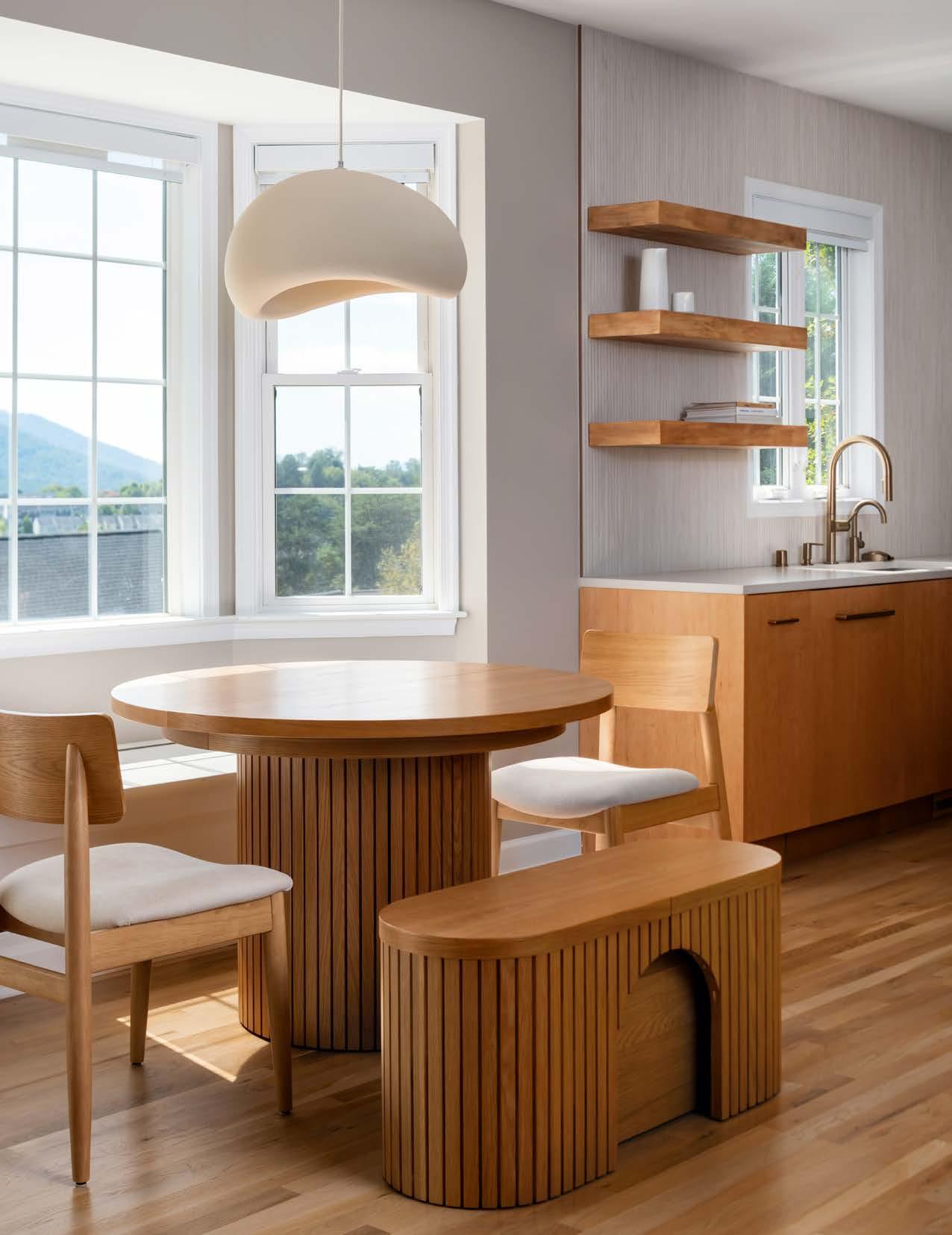 All this attention to warm neutral quiet means the kitchen area feels much lighter without the need to replace or enlarge any windows on the exterior wall. This is a hallmark of the Morrells’ approach to the project: using attention to detail to achieve custom quality while respecting budget parameters. The architects investigated a wide range of cabinet suppliers for textures, grains, colors, and installation time; they even tried out samples on site with the Wilsons at different times of day to check on color and compatibility.