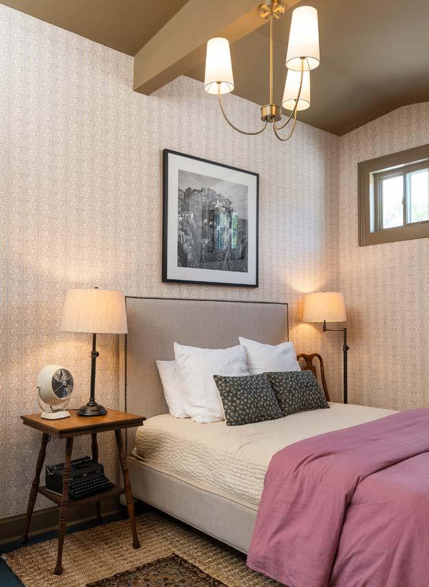 calm that fits the house, and Bazemore echoes Lane’s words: “This house told us what it would be.” The walls are painted a soft white, which bounces the light around and shows off the range of colorful wall decorations, from tiles and plates to modern posters and photographs. A lot of the detailing is wood, which adds warmth and suits the historic character. The existing gas fireplace was upgraded to fit in with the cleaner look.