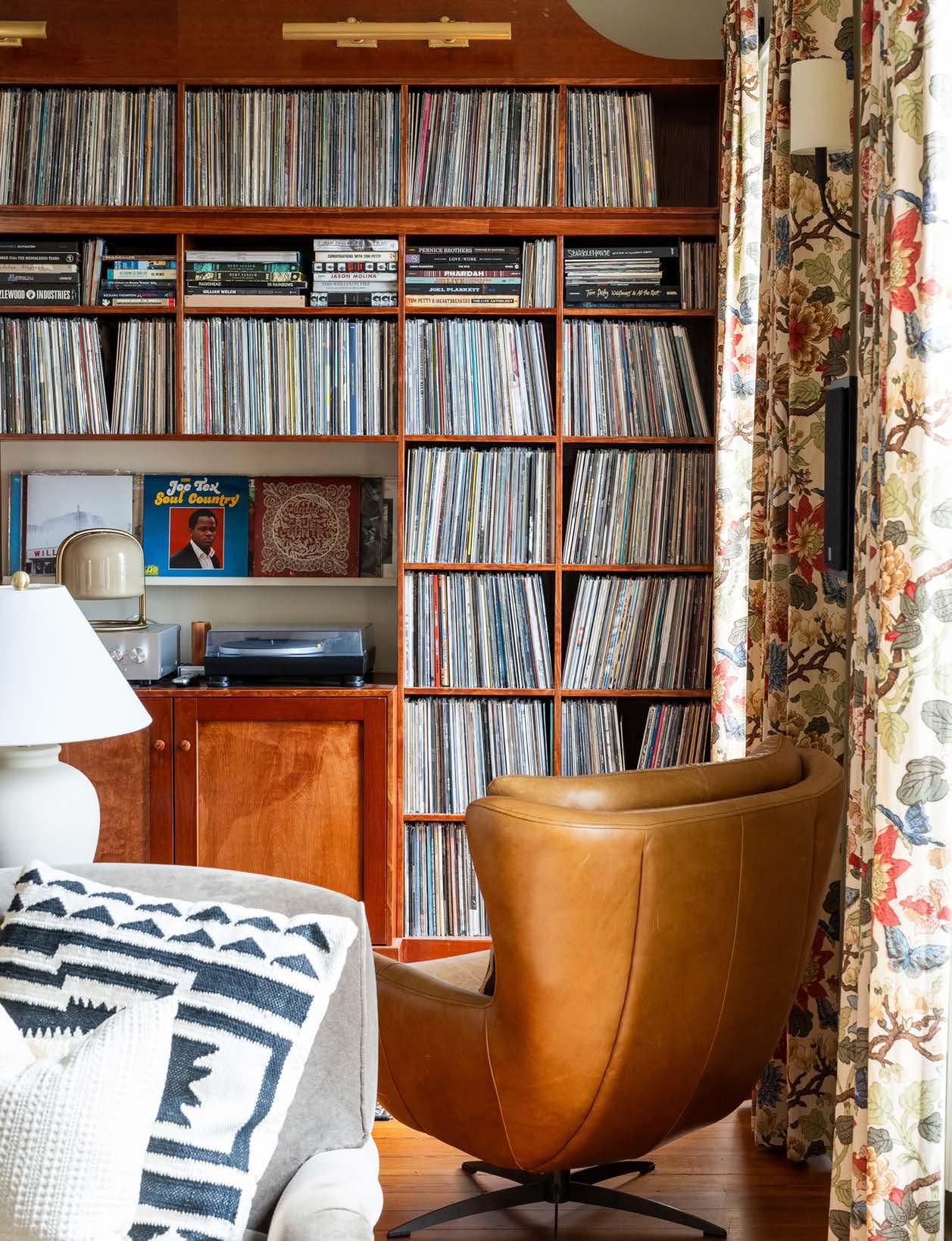 There were some non-negotiables on their list. Pelton has an extensive vinyl record collection, and its storage/display wall required additional structural sup-