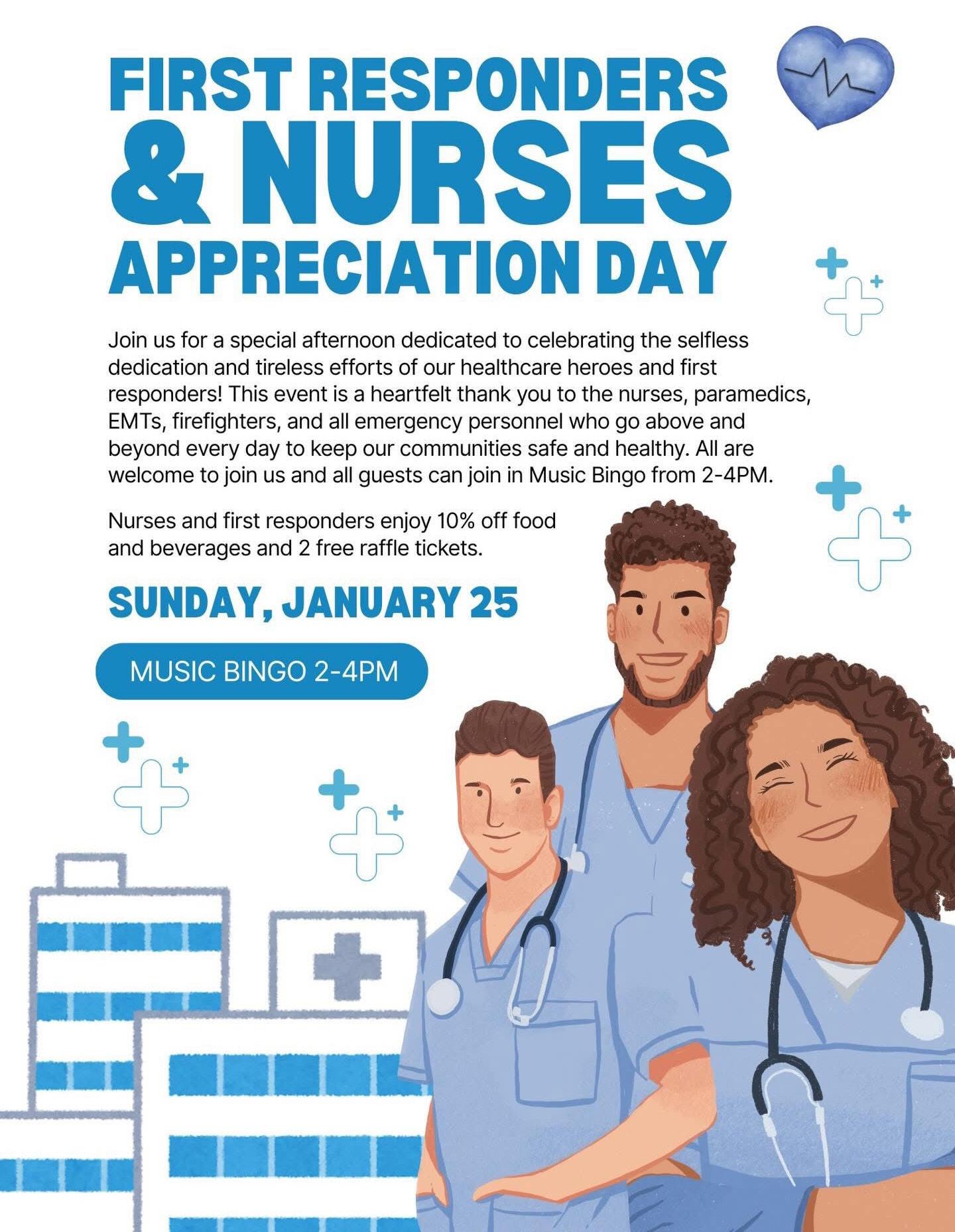 Music Bingo and Nurses/First Responders Appreciation Day| Sunday, January 25th from 2-4PM (open 12-5PM)