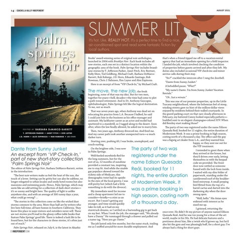 Dante From Sunny Junket An excerpt from ‘VIP Check-In,’ part of new short-story collection ‘Palm Springs Noir’ The editor of Palm Springs Noir, Barbara DeMarco-Barrett, writes in the introduction: “The best noir writers make us feel the heat of the sun, the touch of a lover. Setting can be gritty but can also be sublime, no longer relegated to urban locales and seedy hotel rooms but also mansions and swimming pools. Hence, Palm Springs, which may seem like an odd setting for a collection of dark short stories— it’s so sunny and bright here. The quality of light is unlike anywhere else, and with an average of 300 sunny days a year, what could go wrong? … “The stories in this collection come on like the wicked dust storms common to the area. More than half are by writers who live here full-time; all have homes in Southern California. They know this place in ways visitors and outsiders never will. These are not stories you’ll read in the glossy coffee-table books that feature Palm Springs’ good life. There is indeed a lush life to be found here, but for the characters in these stories, it’s often just out of reach.” Palm Springs Noir, released on July 6, is the latest in Akashic CVIndependent.com