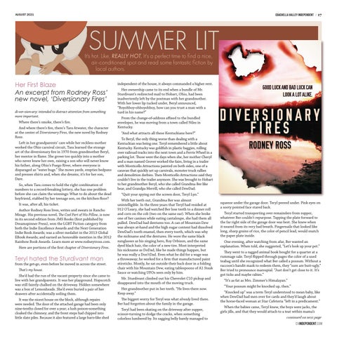 Her First Blaze An excerpt from Rodney Ross’ new novel, ‘Diversionary Fires’ di-ver-sion-ary: intended to distract attention from something more important. Where there’s smoke, there’s fire. And where there’s fire, there’s Tara Atwater, the character at the center of Diversionary Fires, the new novel by Rodney Ross. Left in her grandparents’ care while her reckless mother worked the Ohio carnival circuit, Tara learned the strange art of the diversionary fire in 1970 from grandmother Beryl, her mentor in flame. She grows too quickly into a mother who never knew her own, raising a son who will never know his father, along Ohio’s Fuego River, where everyone is disparaged as “water bugs.” She mows yards, empties bedpans and presses shirts and, when she dreams, it’s for her son, Dare. So, when Tara comes to hold the right combination of numbers to a record-breaking lottery, she has one problem before she can claim the winnings: What to do about the dead boyfriend, stabbed by her teenage son, on the kitchen floor? It was, after all, his ticket. Author Rodney Ross lives, writes and sweats in Rancho Mirage. His previous novel, The Cool Part of His Pillow, is now in its second edition from JMS Books (first published by Dreamspinner Press), won the LGBT Fiction category from both the Indie Excellence Awards and the Next Generation Indie Book Awards; was a silver medalist in the 2013 Global EBook Awards; and earned an honorable mention in the 2012 Rainbow Book Awards. Learn more at www.rodneytross.com. Here are portions of the first chapter of Diversionary Fires.